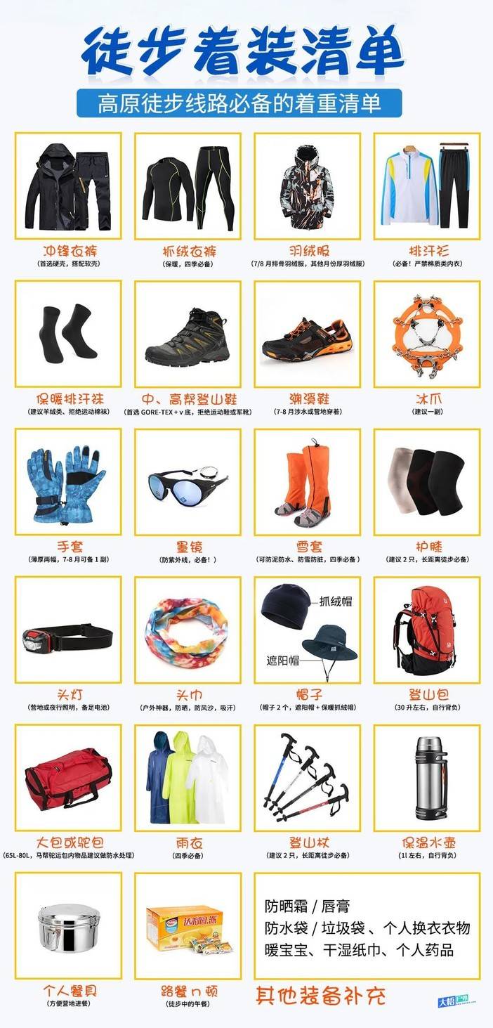 对一般徒步来讲,对衣服的要求不高,一般的速干+抓绒+冲锋衣足够了,不同的线路会有不同的要求,要根据线路做调整。
