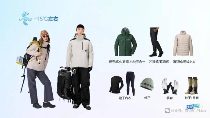 上衣外层:防风防水的冲锋衣是必不可少的,能有效阻挡寒风和雪花。