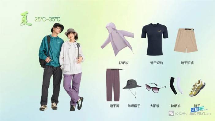 上衣外层:可以穿一件轻薄的防晒衣,具有防紫外线功能,同时透气性能好。有些防晒衣还带有帽子,可以保护头部和颈部。
