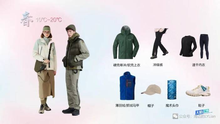 上衣中层:可添加一件薄抓绒衣或防风软壳。抓绒衣轻便保暖,在天气稍凉时提供额外的温暖。防风软壳则能阻挡春风,同时具有一定的透气性。