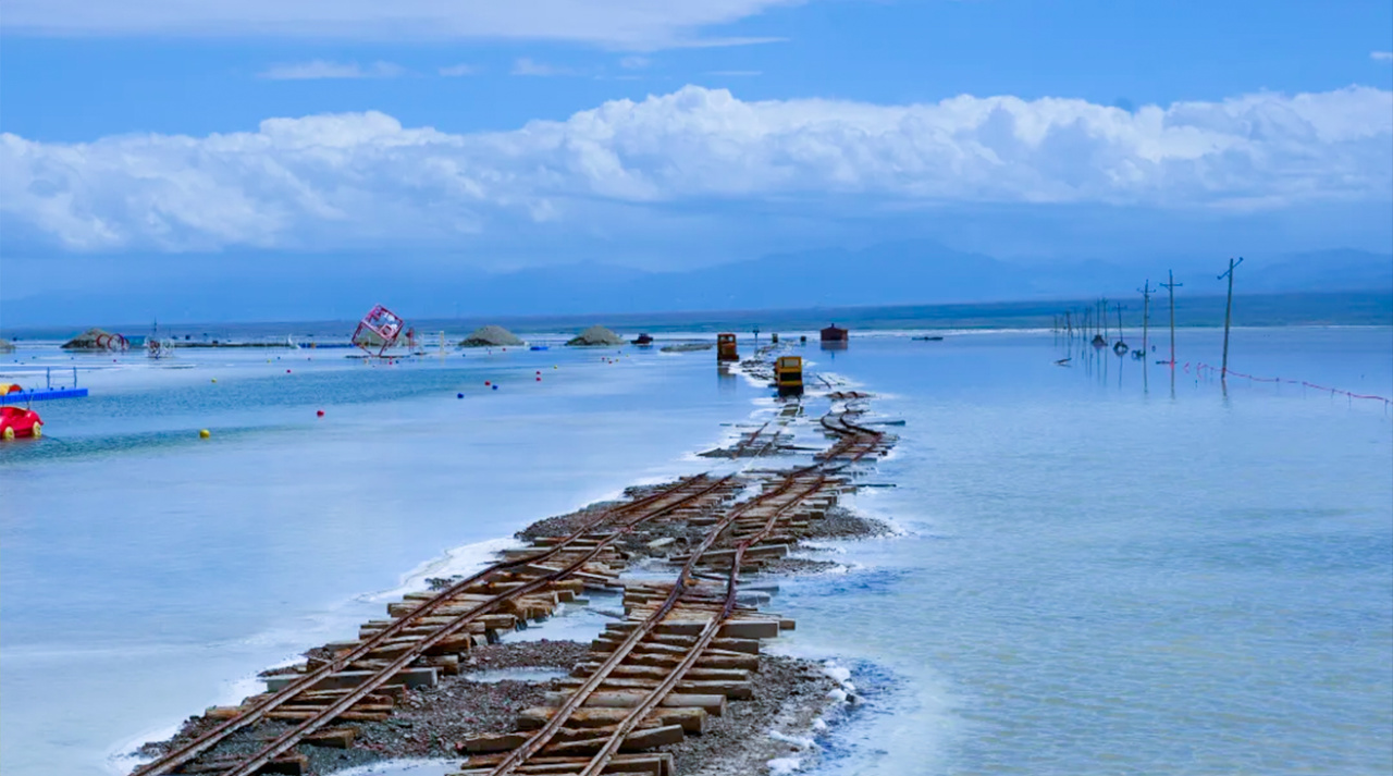 结晶之上是一层薄薄的卤水,将天空、云朵和对岸的山都倒映在白色的湖里,非常漂亮,所以也被称为“中国的天空之境”。可以乘坐景区内的小火车前往景区深处游玩,如果不乘坐小火车,也可以沿着铁轨向湖深处散散步拍拍照片也是非常惬意。