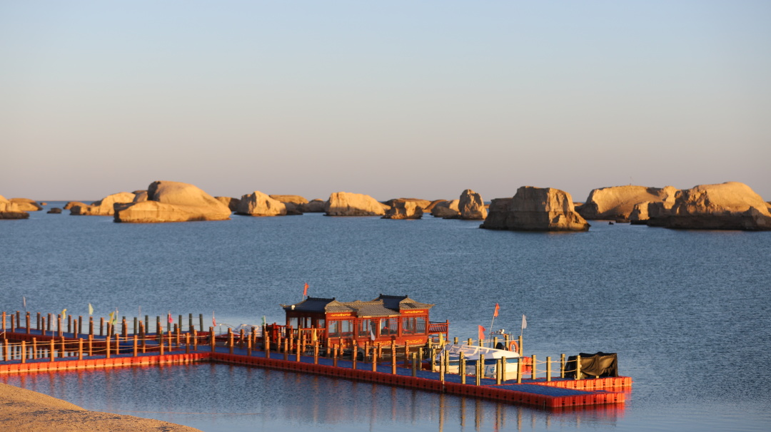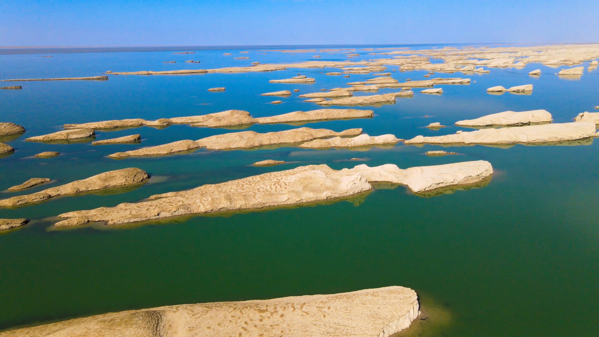 车子继续向前行进,来到至今鲜少有人涉足的【水上雅丹】,如果说敦煌的雅丹有万舰齐发之势,那么水上雅丹的风景对于这个称呼更为形象贴切,这里的雅丹群经过年复一年的风雨残蚀,如同遨游大海显露脊背的群鲸,湖岸边高大的鲸背是天然的观景台,极目远望,西边是高低错落的水上雅丹地貌群,又被游客们称作“百鸟千岛湖”。