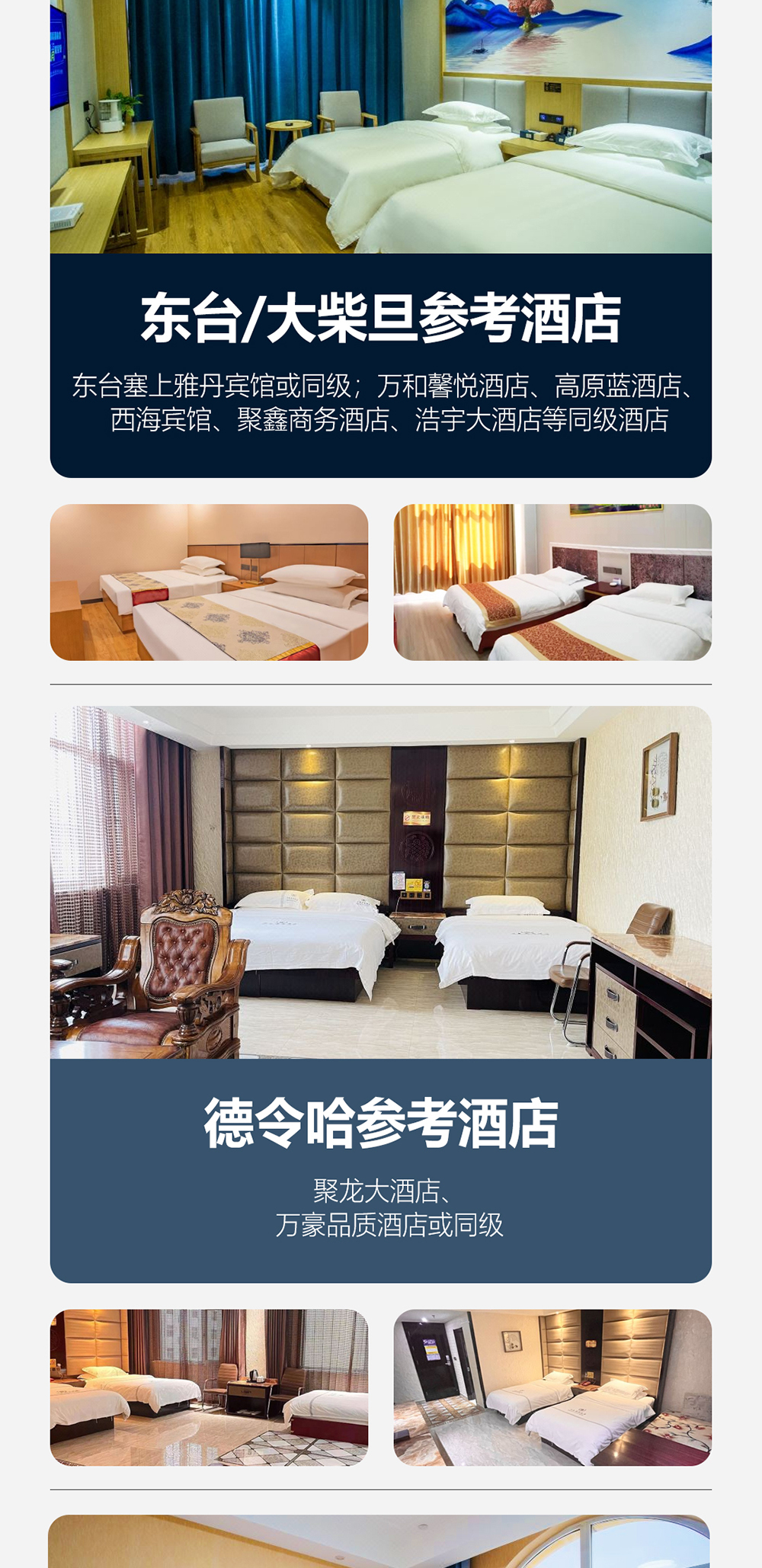 住宿:东台塞上雅丹宾馆或同级;万和馨悦酒店、高原蓝酒店、西海宾馆、聚鑫商务酒店、浩宇大酒店等同级酒店
