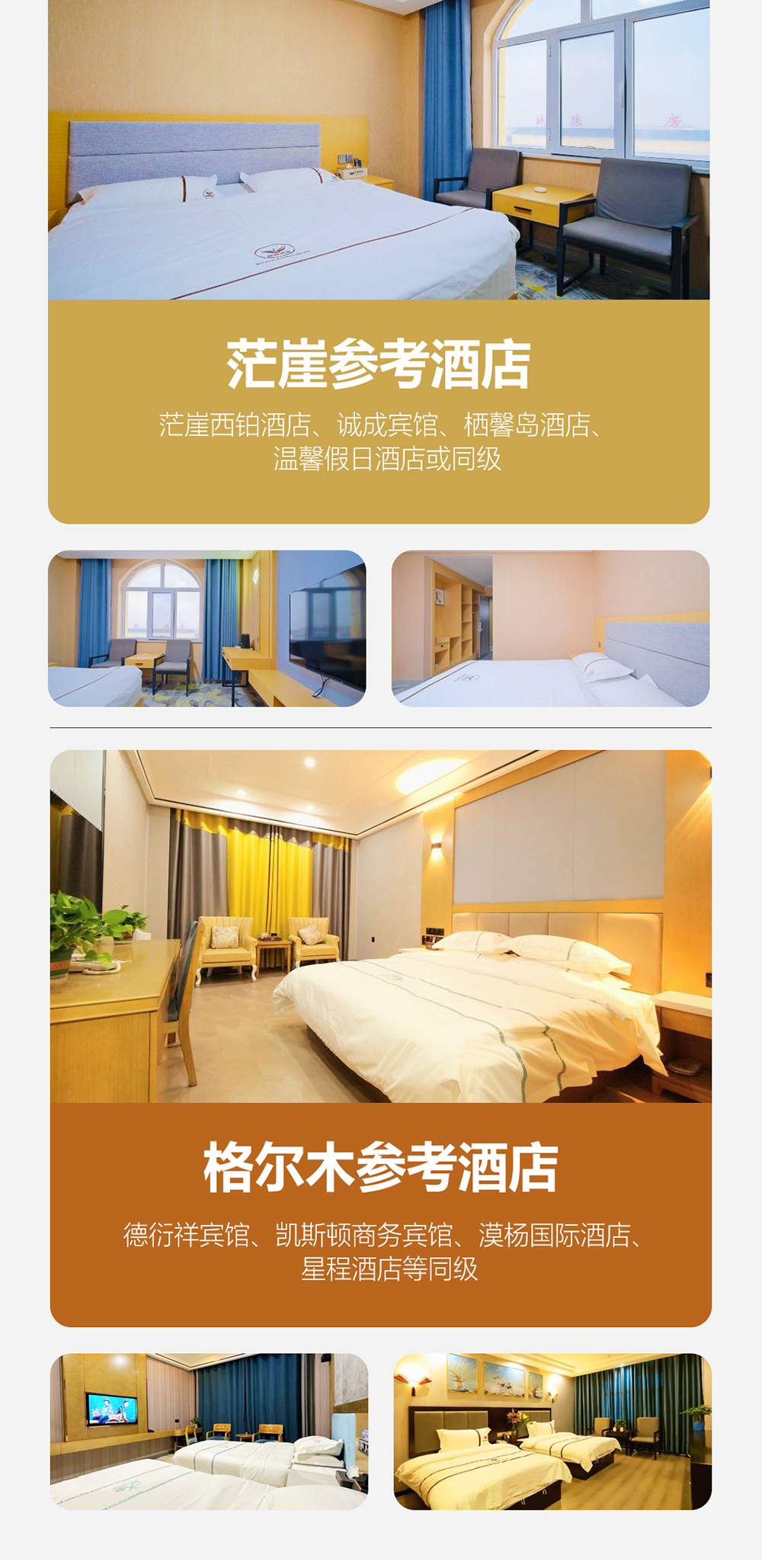 住宿:茫崖西铂酒店、诚成宾馆、栖馨岛酒店、温馨假日酒店或同级