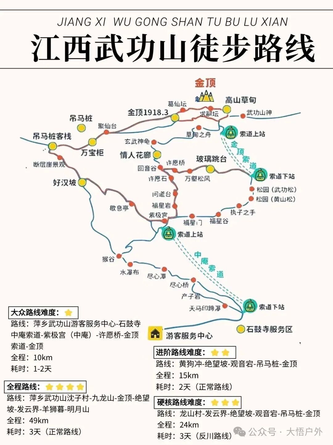 【A景区打卡线路】武功山游客中心—转运车—石鼓寺—中庵索道—好汉坡—吊马桩—星空营地—金顶—金顶索道—玻璃眺台—许愿桥—紫极宫—中庵索道—景区大门(约15公里)